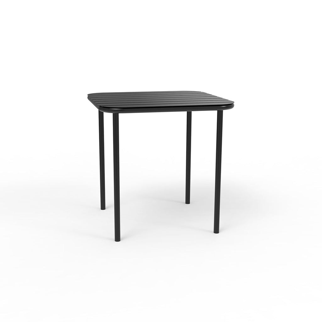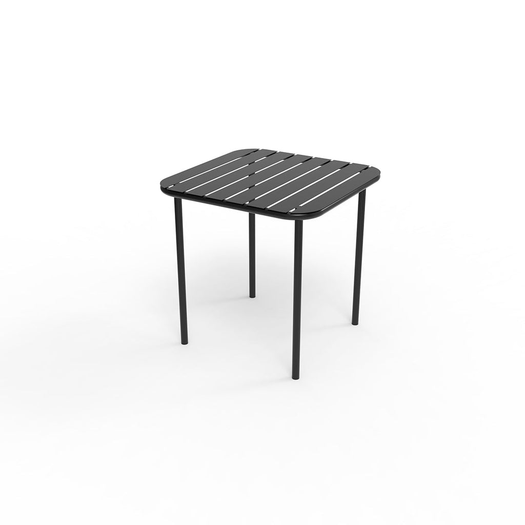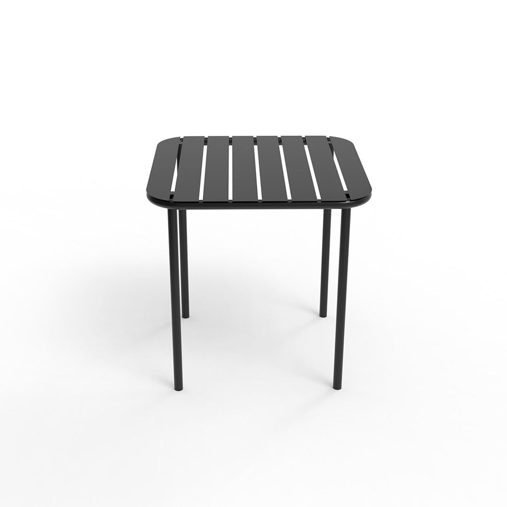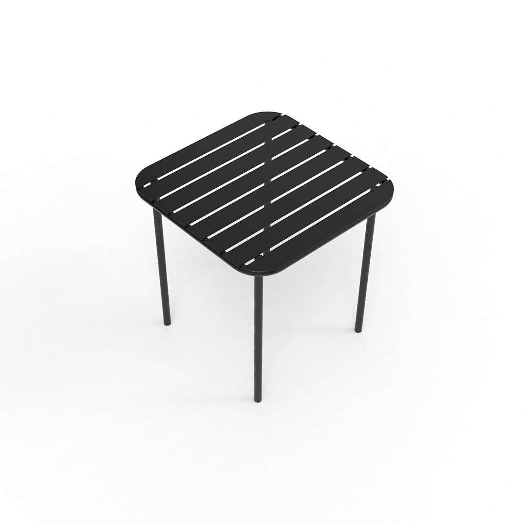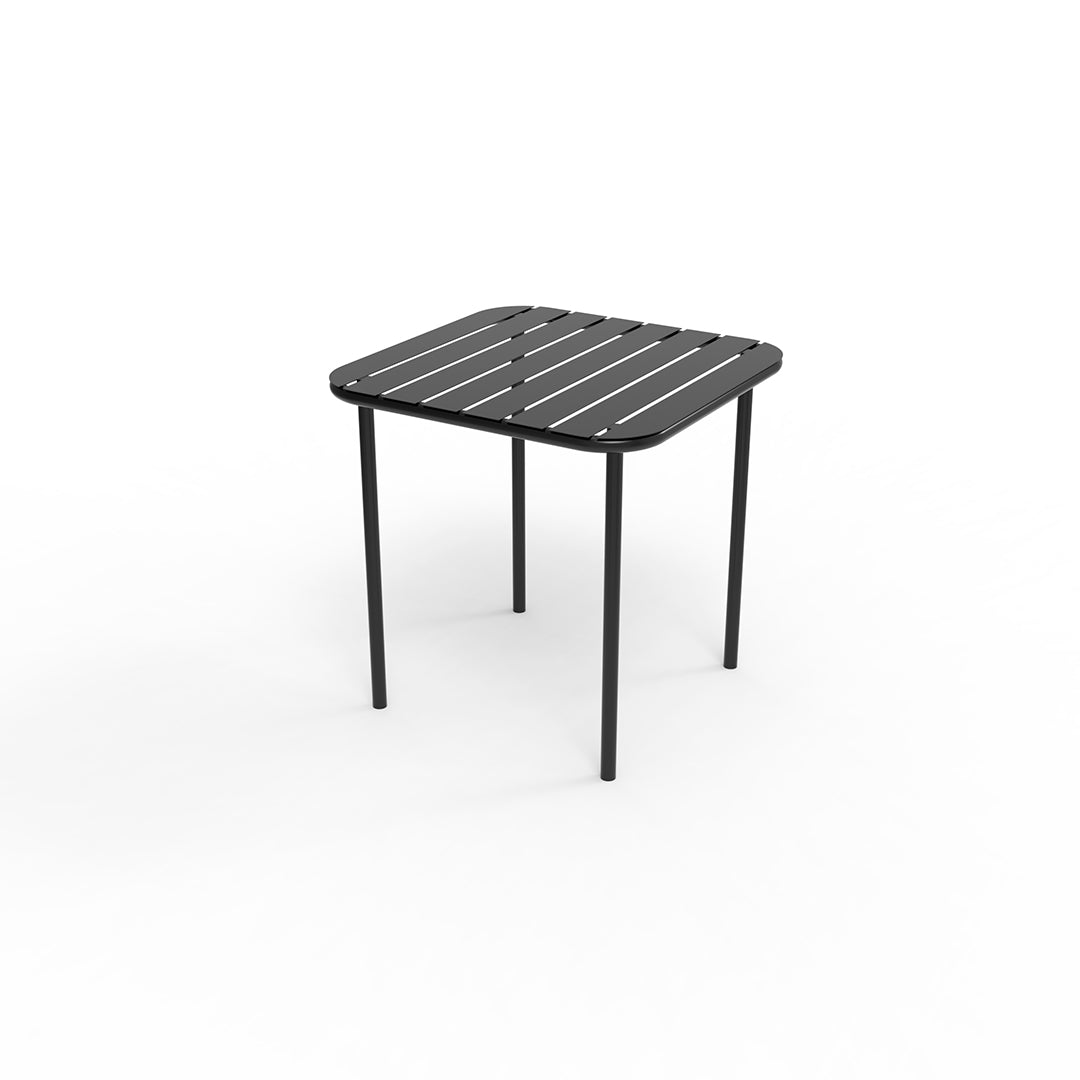 Cuenta con una cubierta fábrica a base de tiras de lámina negra cal.18. con una separación entre ellas para fácil limpieza, la cual se sueldan a un marco metálico fabricado en perfil redondo de 1” cal 18. en acabado pintura electrostática color negro semi mate, consta de 4 patas desarmables fabricadas en perfil redondo de 1” soportadas sobre nivelador.