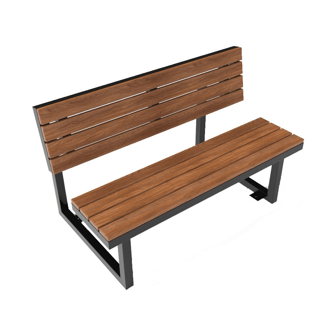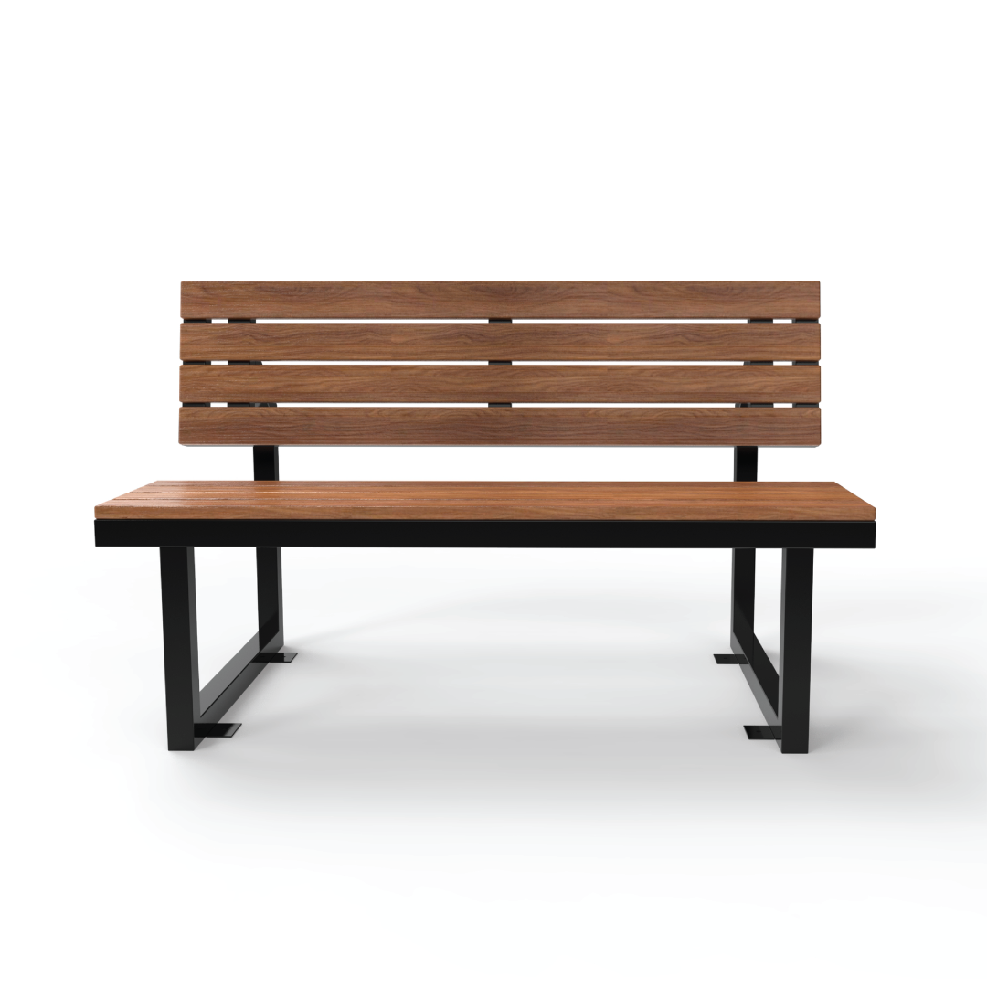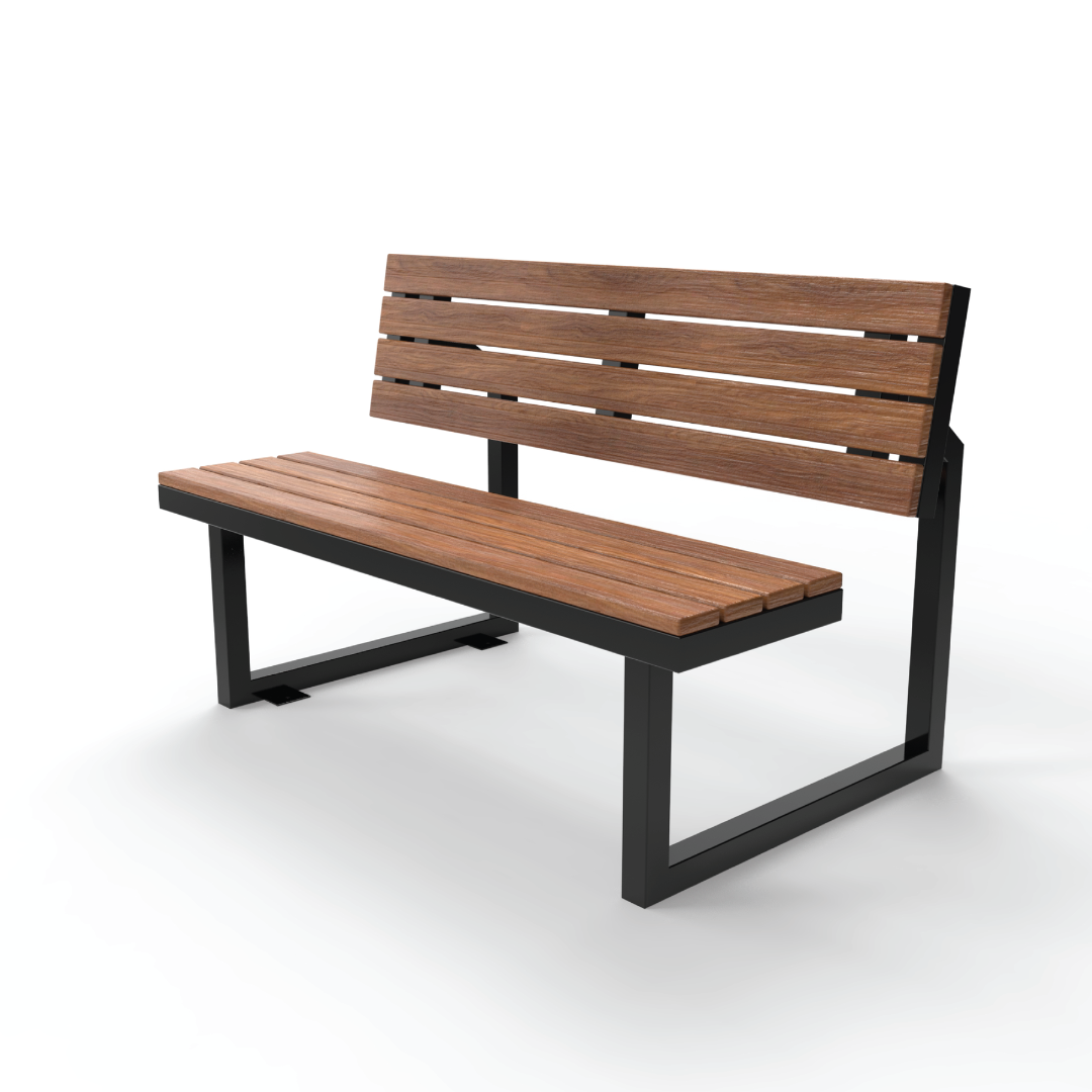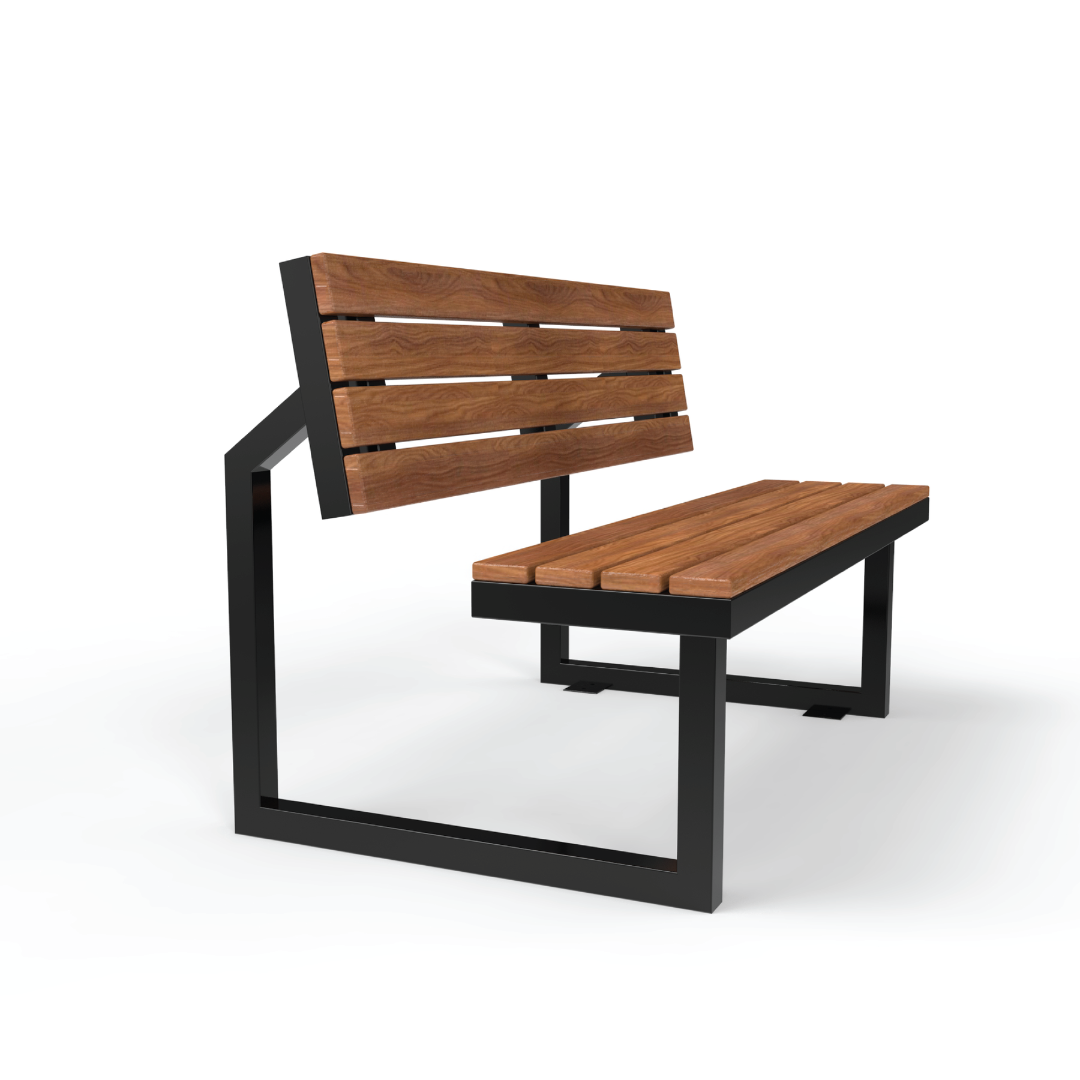 Estructura principal y refuerzos fabricados a partir de perfil cuadrado metálico. Se cuenta con la opción de tiras de plastimadera para conformar el asiento y respaldo o madera.