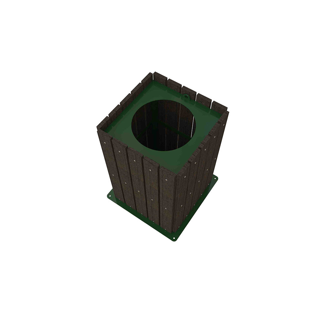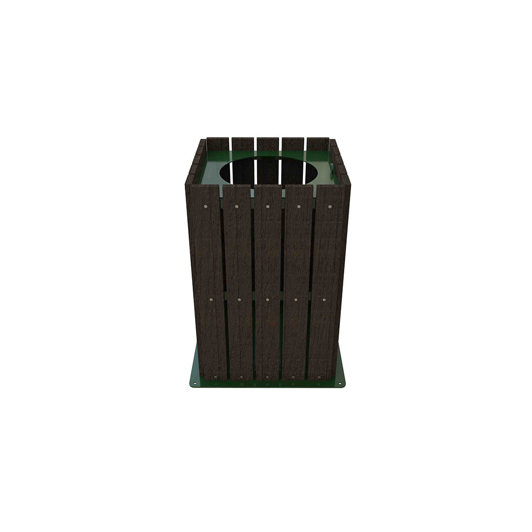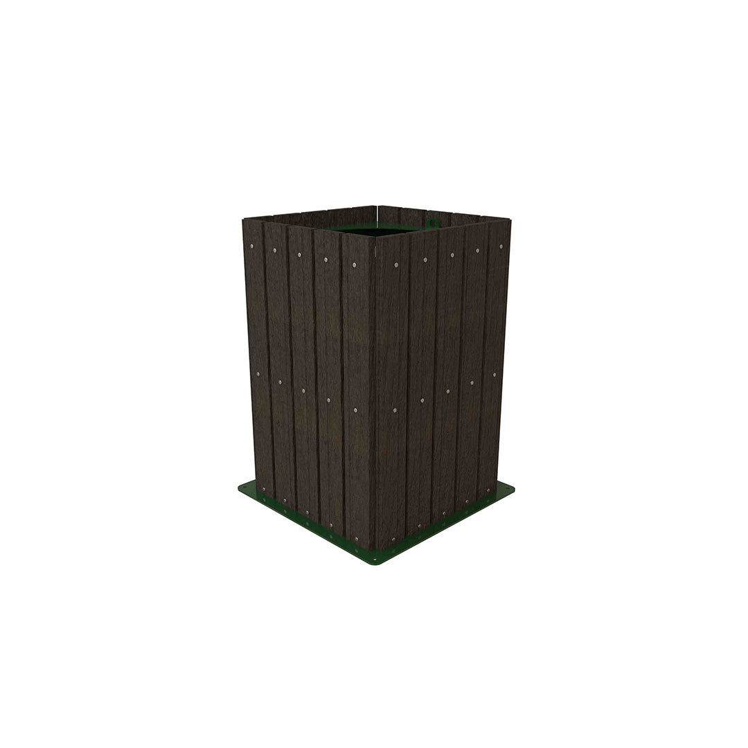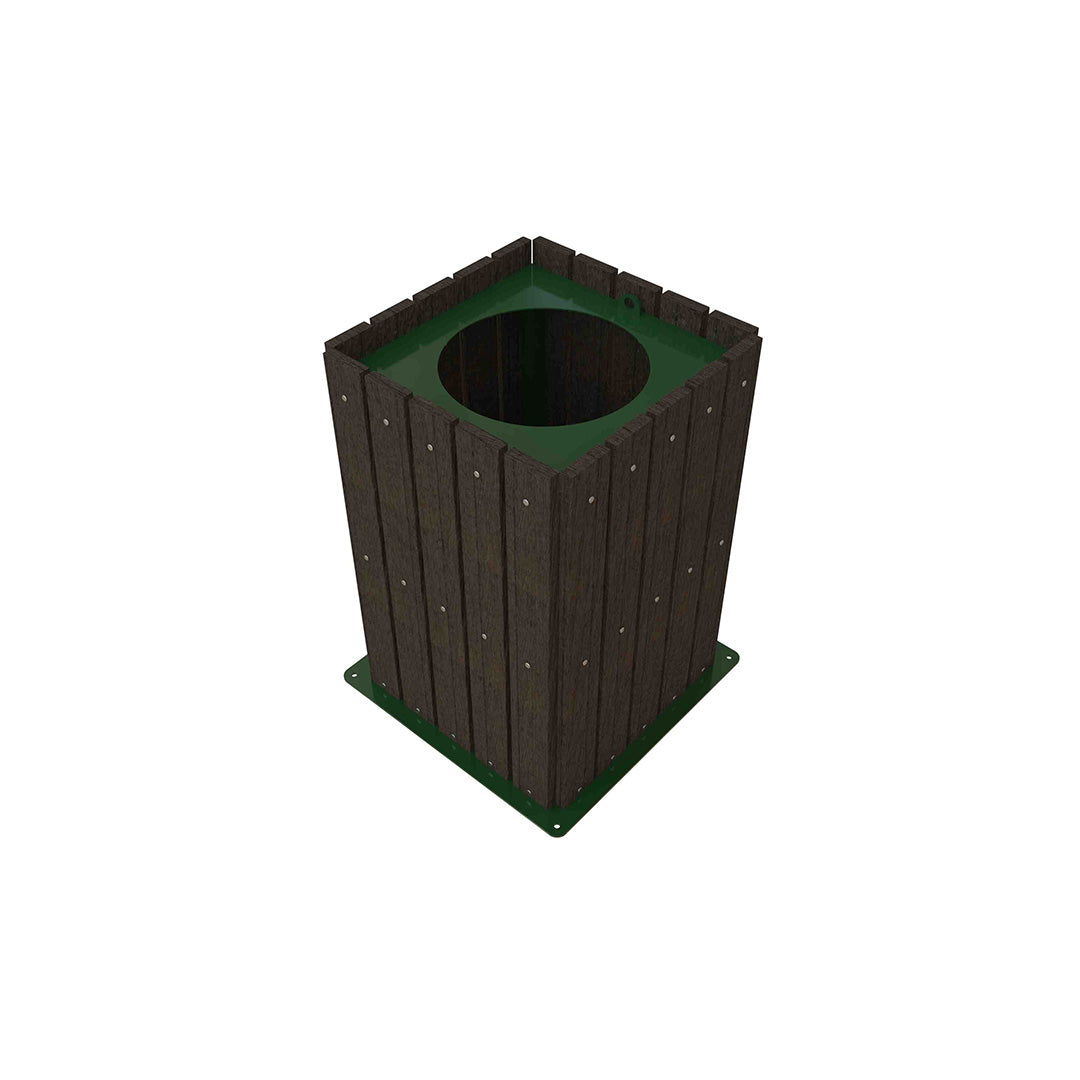 Estructura principal conformada por 4 postes metálicos en perfil 1 ½ x 1 ½” en cal. 18, unido a la estructura principal se encuentran 12 soleras de 1 ½” de refuerzo, tapa superior abatible con perforación en cal. 14 y placa inferior de anclaje en cal. 10 unida a la estructura metálica por medio de insertos roscables, 20 tiras de plastimadera de 1”, todas las uniones del producto son a base de soldadura tipo mig, el acabado es pintura electrostática
