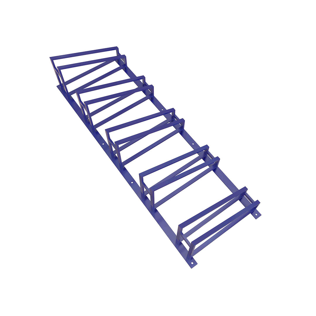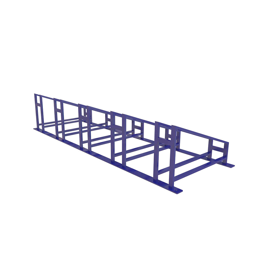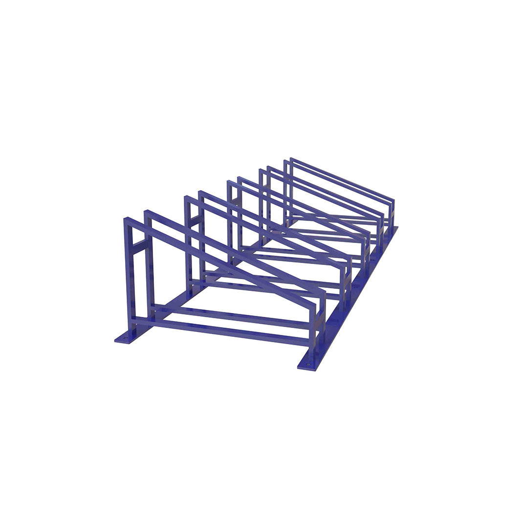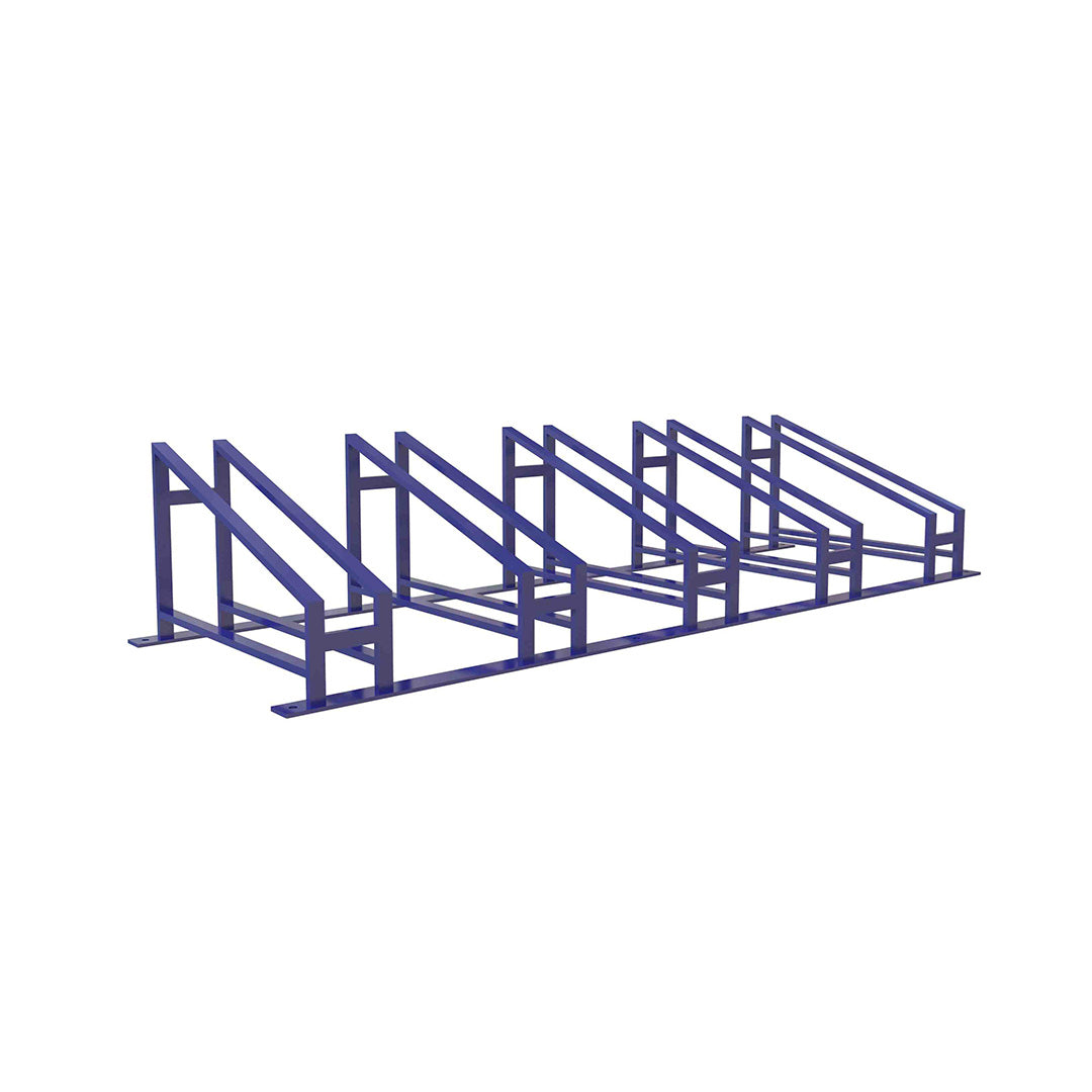 Estructura principal fabricada en perfil de 1 x ½” en cal. 18, cuenta con 5 espacios para bicicleta, cuenta con una placa inferior de anclaje en solera de 2” unida a las estructuras metálica individuales, todas las uniones del producto son a base de soldadura tipo mig, el acabado es pintura electrostática.