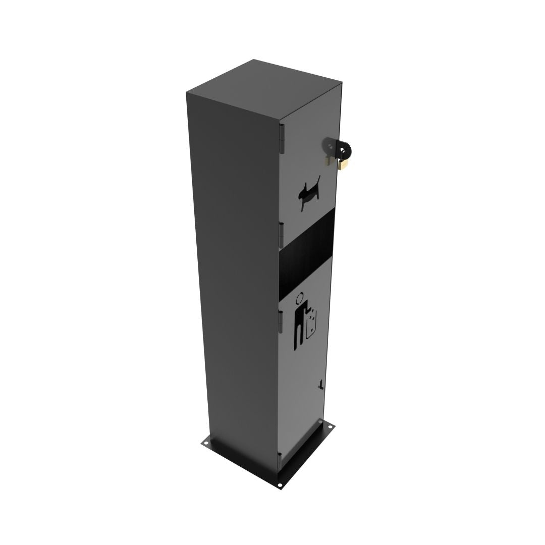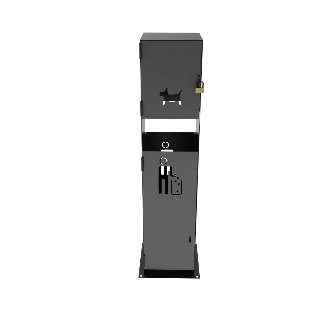 Contenedor para mascotas fabricado a partir de lámina de acero negra rolada en frio en calibre 14, incluye un dispensador de bolsa en la parte superior, en la parte inferior se encuentran unos ganchos para la fijación del la bolsa, tiene una puerta abatible para el fácil acceso y limpieza del contenedor.