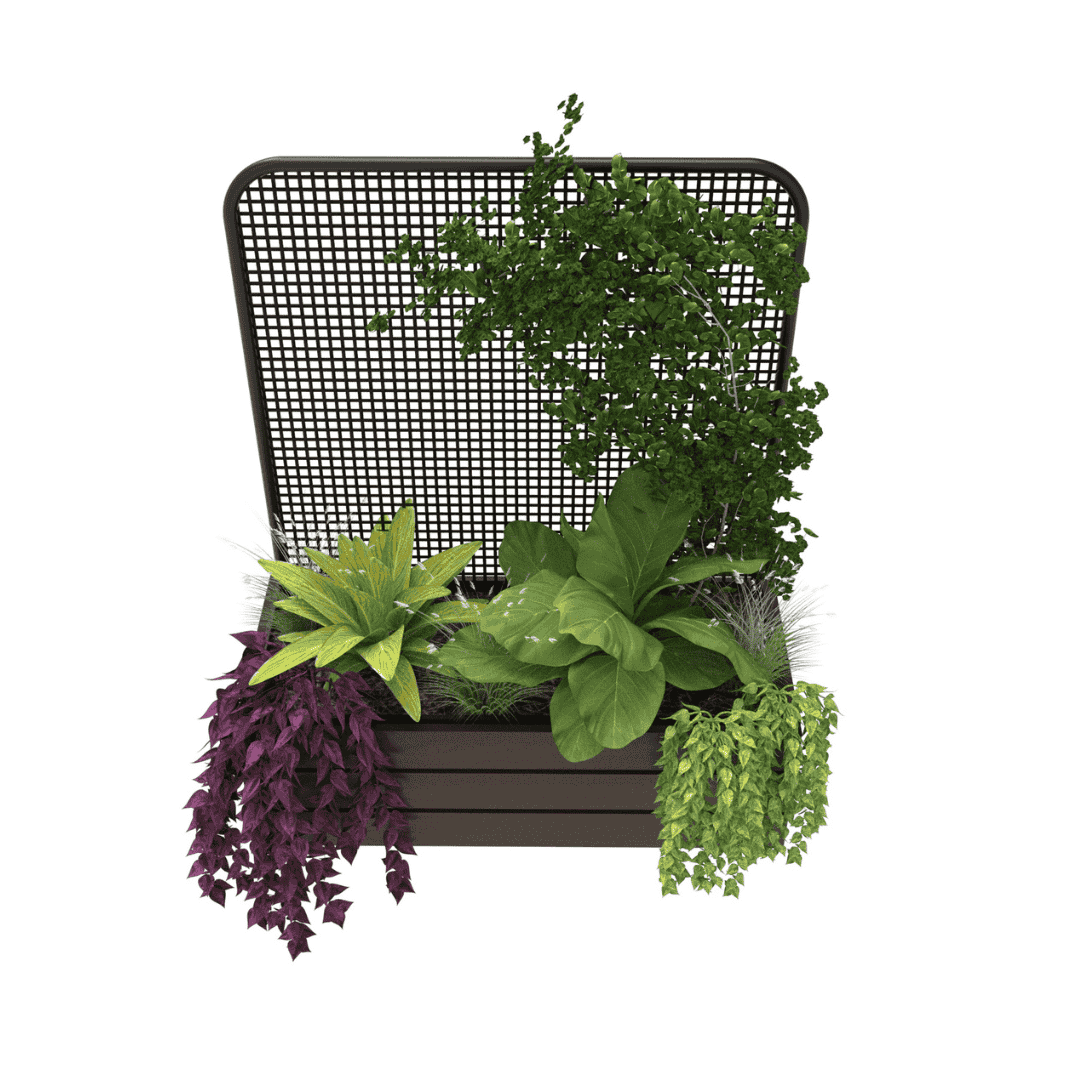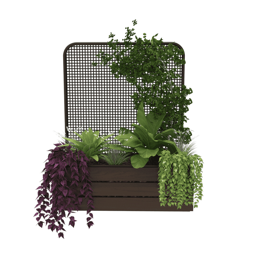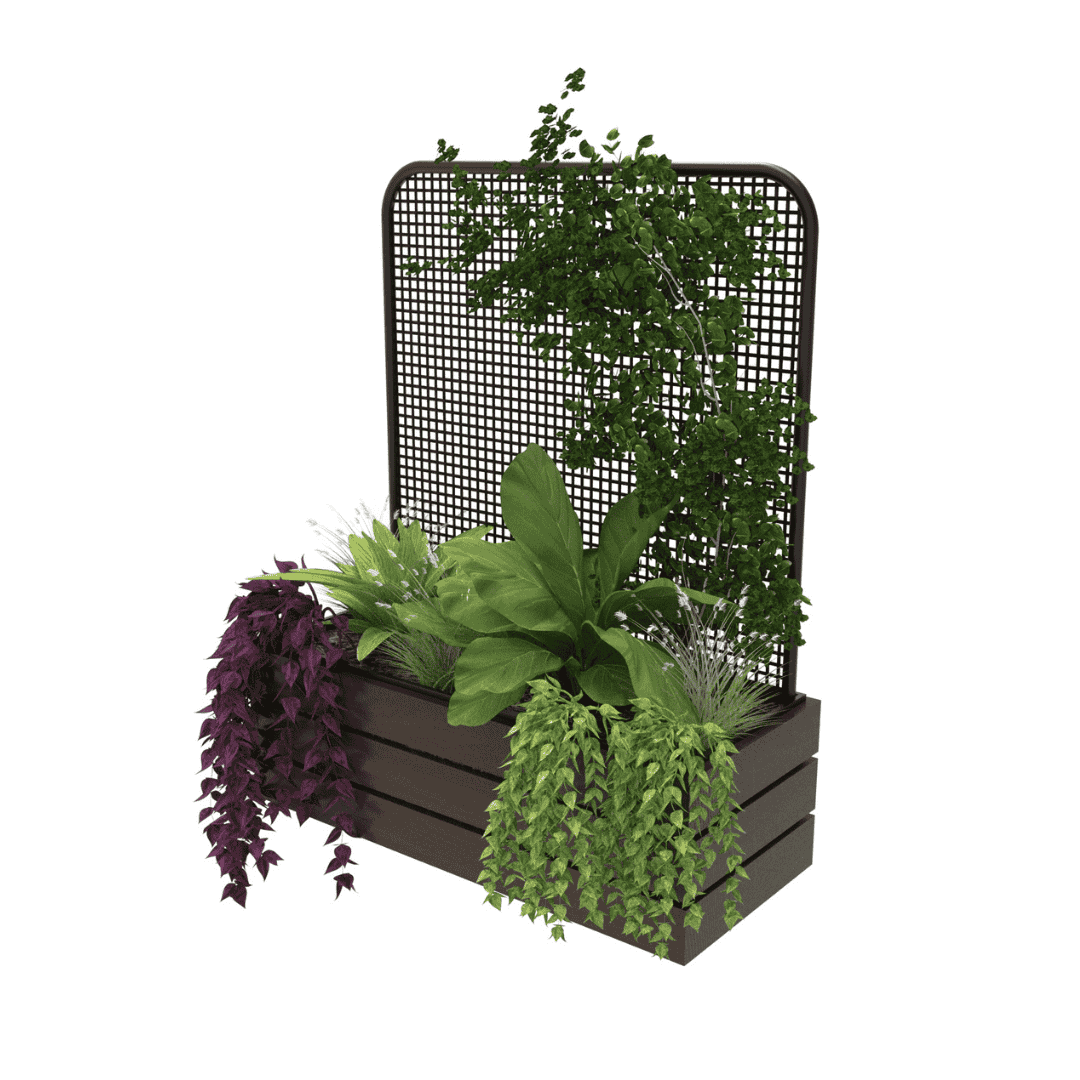 Maceta fabricada en lamina de acero, cuenta con perforaciones en su base para el libre drenaje del agua. En los laterales de la maceta se fijan tiras de plastimadera o madera, según la elección del cliente. Cuenta con una mampara unida a la estructura metálica fabricada en perfil redondo en forma de portería la cual tiene una parrilla de alambrón.