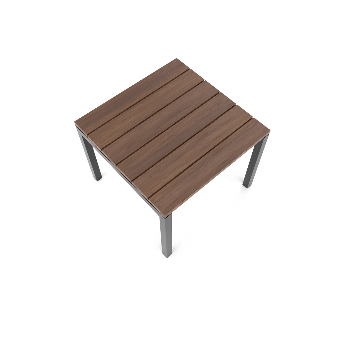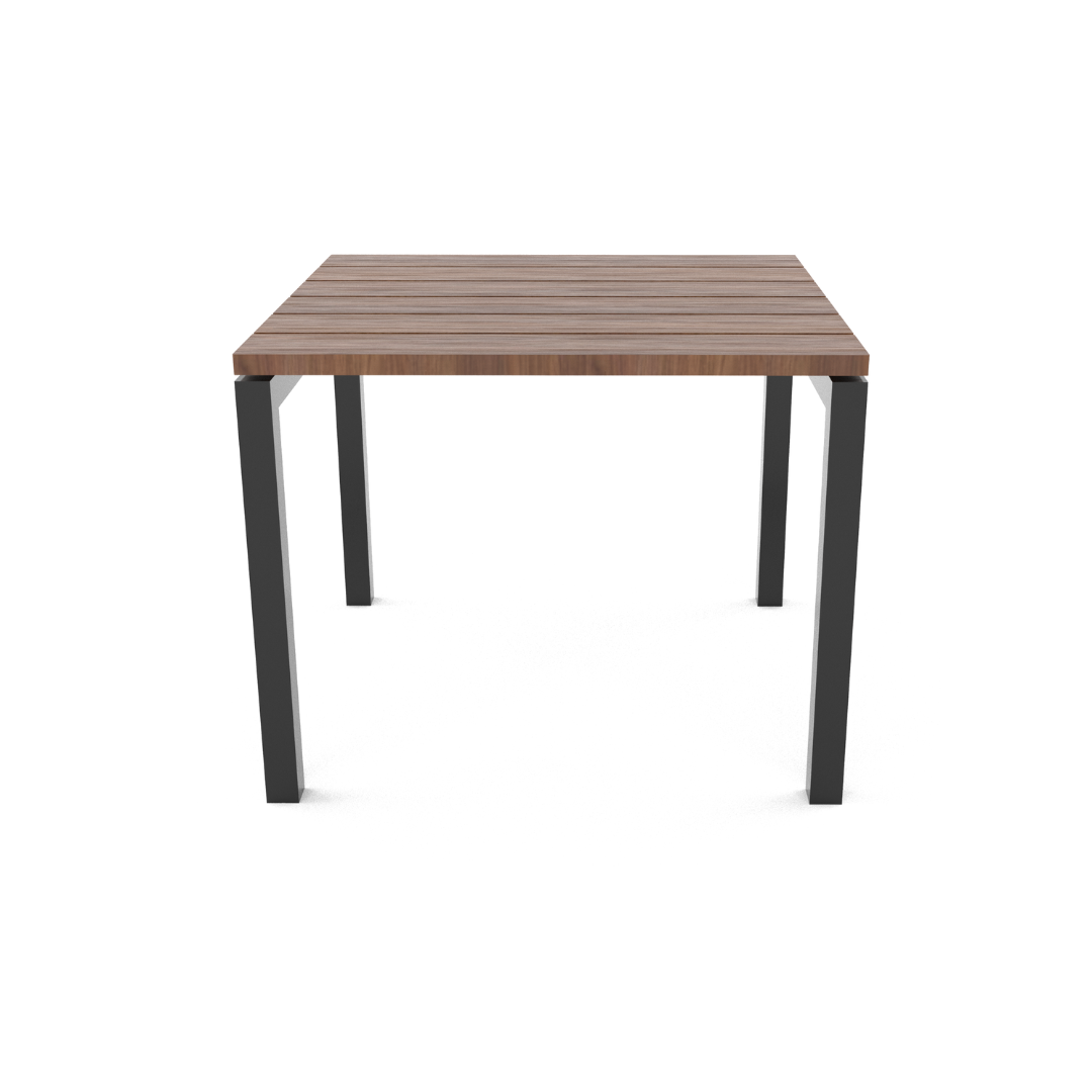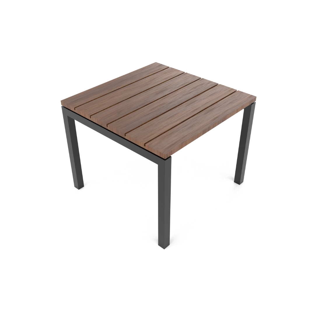 Mesa para cuatro personas, con cubierta de polietileno de alta resistencia 100% reciclado y reciclable, ideal para espacios al exterior, ya que es resistente a la intemperie, no absorbe humedad y no requiere de mantenimiento. El color es café oscuro y puede tener una variación de tonalidad de hasta un 10%.