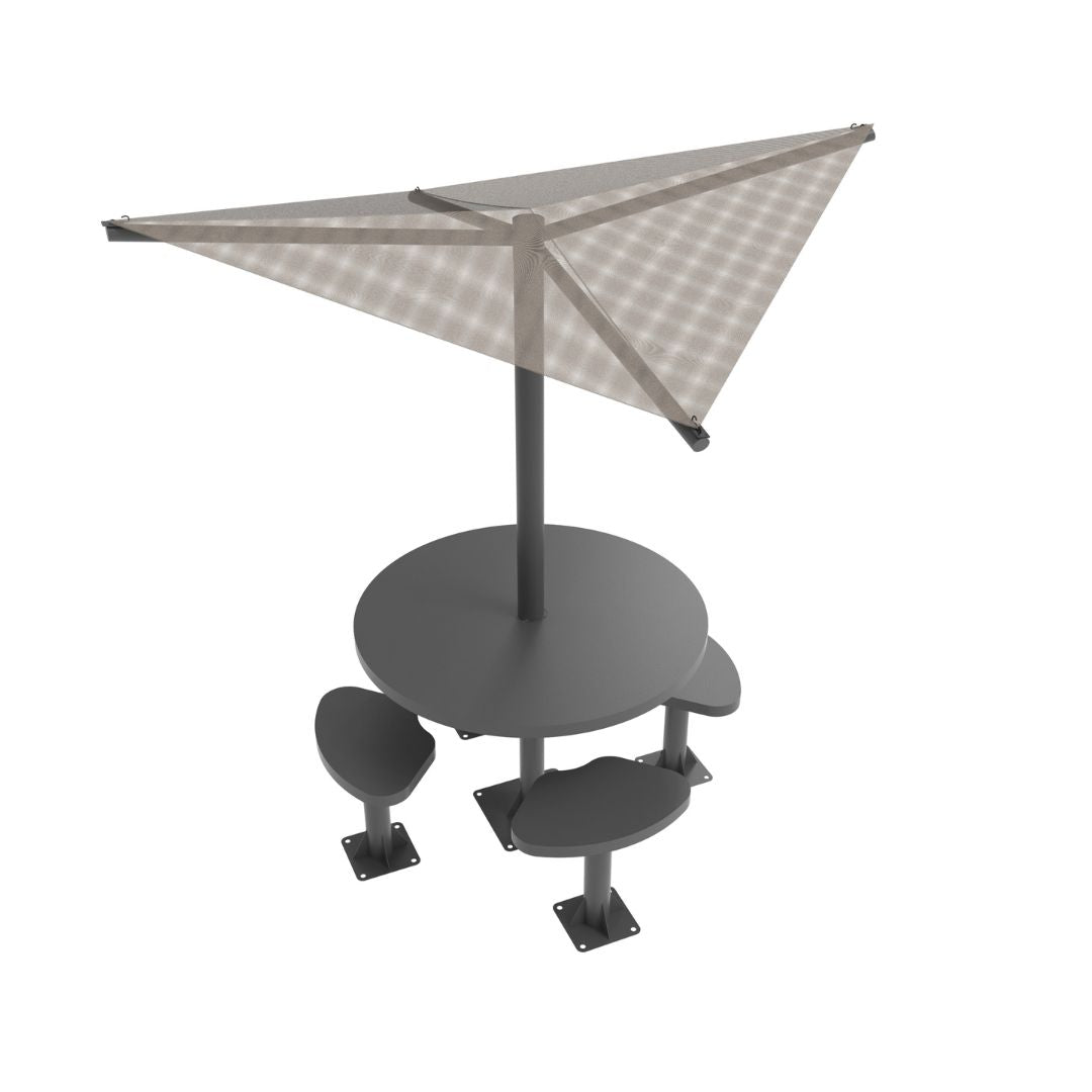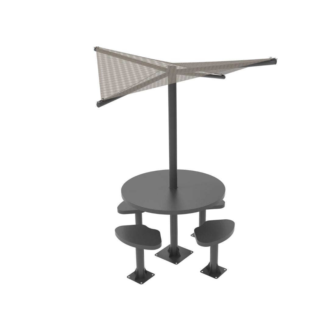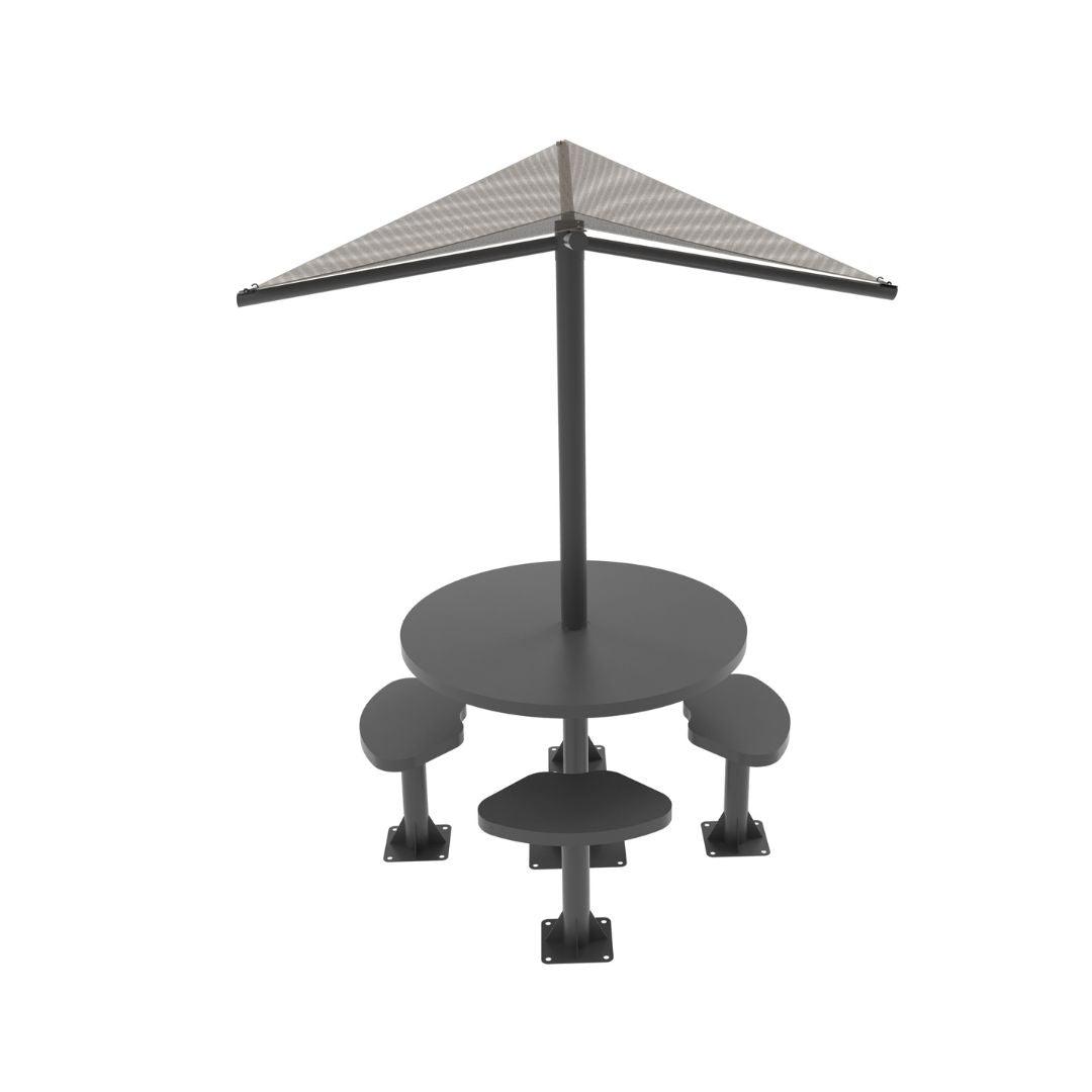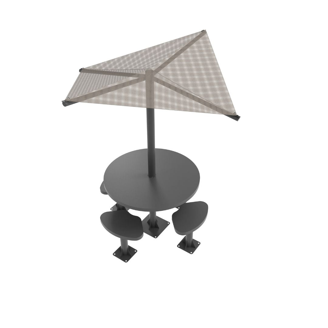 La velaria es de malla sombra y está fabricada con un poste principal 4 perfiles. La mesa circular fabricada en lamina negra rolada en frío. Los bancos fabricados en lamina negra rolada en frío y soporte en perfil redondo. Se incluye malla sombra en color beige.