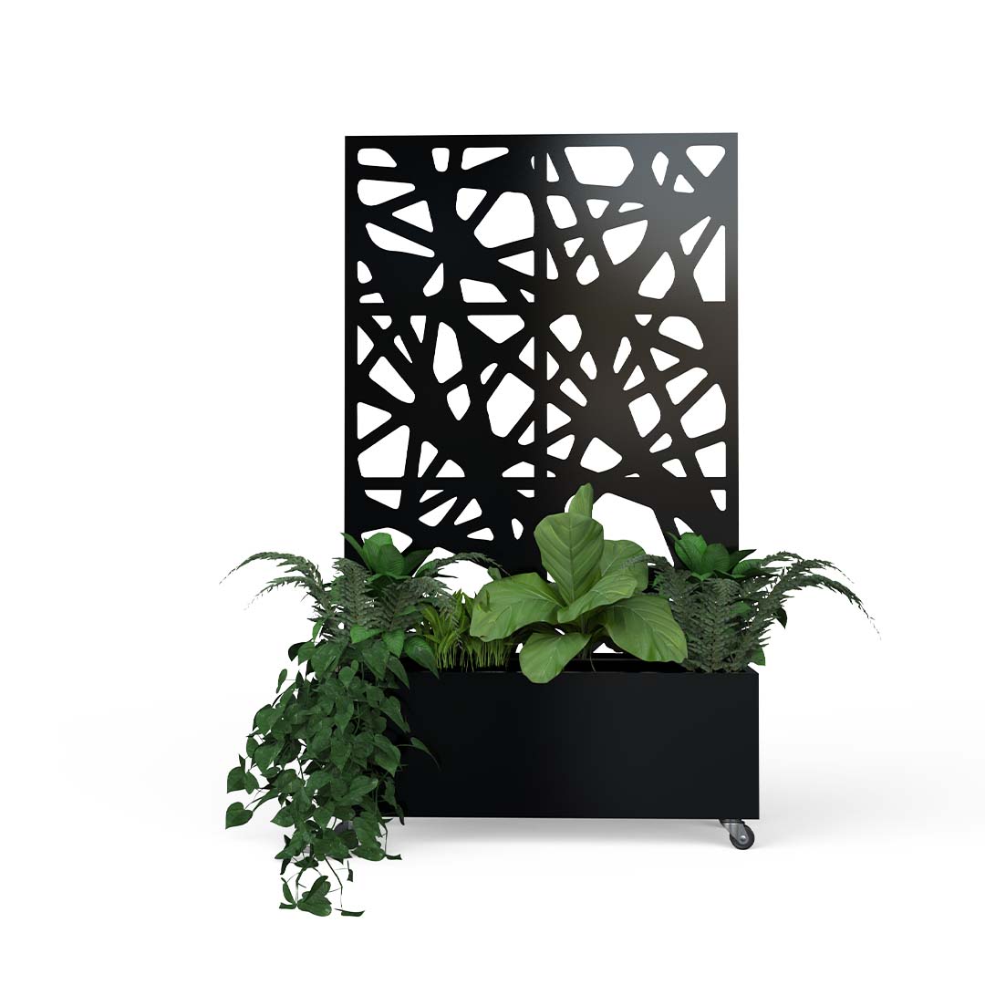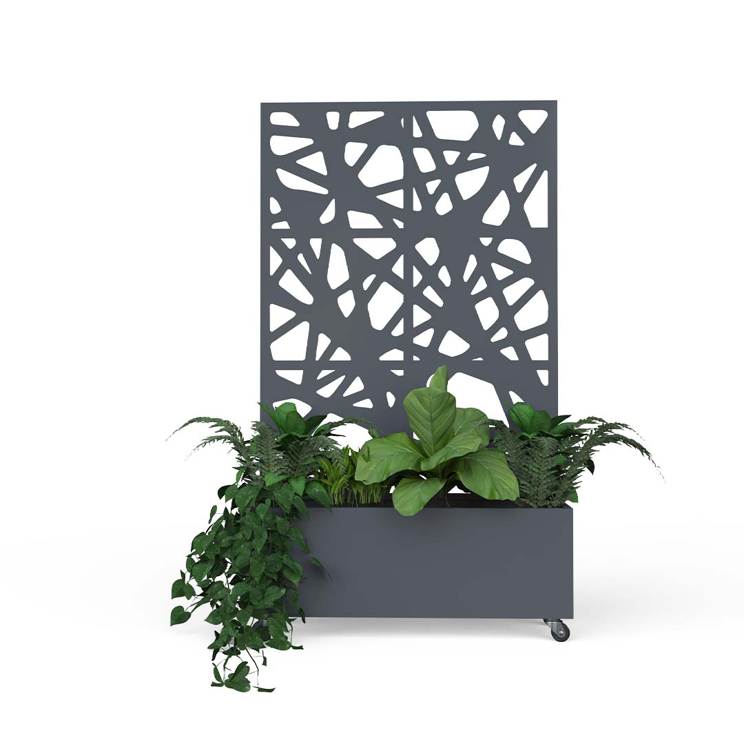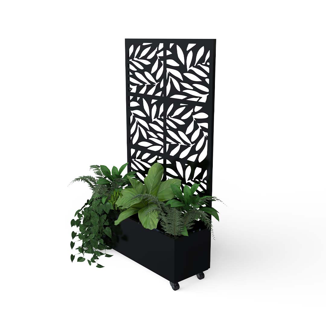 Fabricado a partir de un marco perimetral en perfil rectangular. En su parte superior cuenta con una pantalla de celosía fabricada en lamina de cal.16 y pintura electrostática, la jardinería está soportada sobre una placa metálica que le da estabilidad e incluye ruedas.