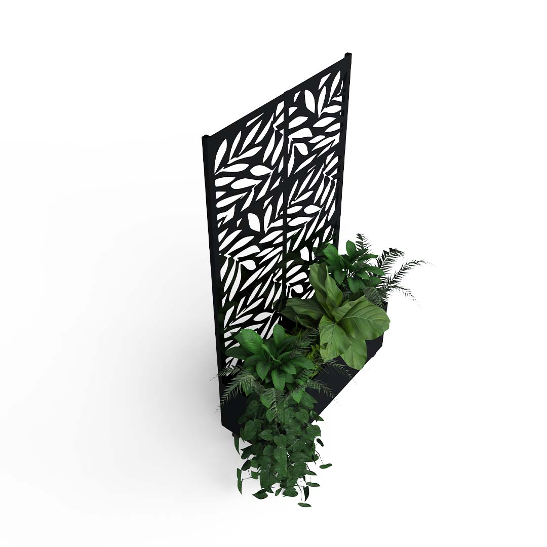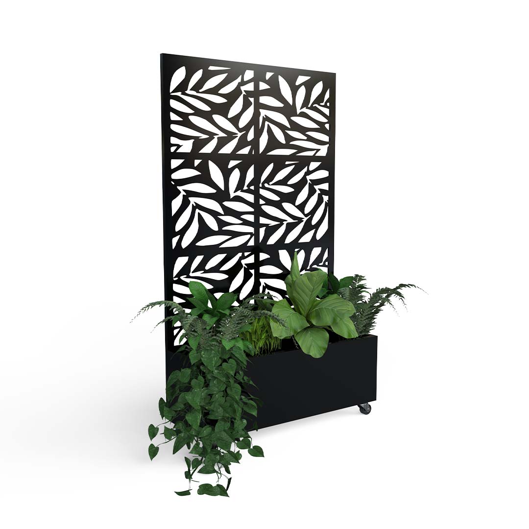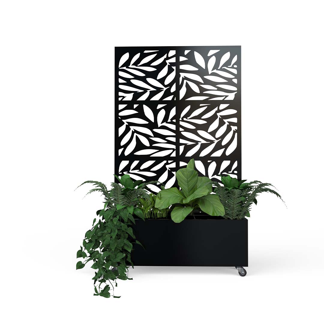 Fabricado a partir de un marco perimetral en perfil rectangular. En su parte superior cuenta con una pantalla de celosía fabricada en lamina de cal.16 y pintura electrostática, la jardinería está soportada sobre una placa metálica que le da estabilidad e incluye ruedas.