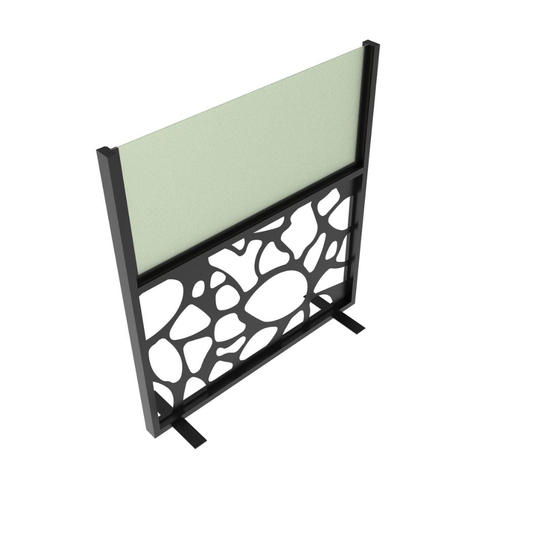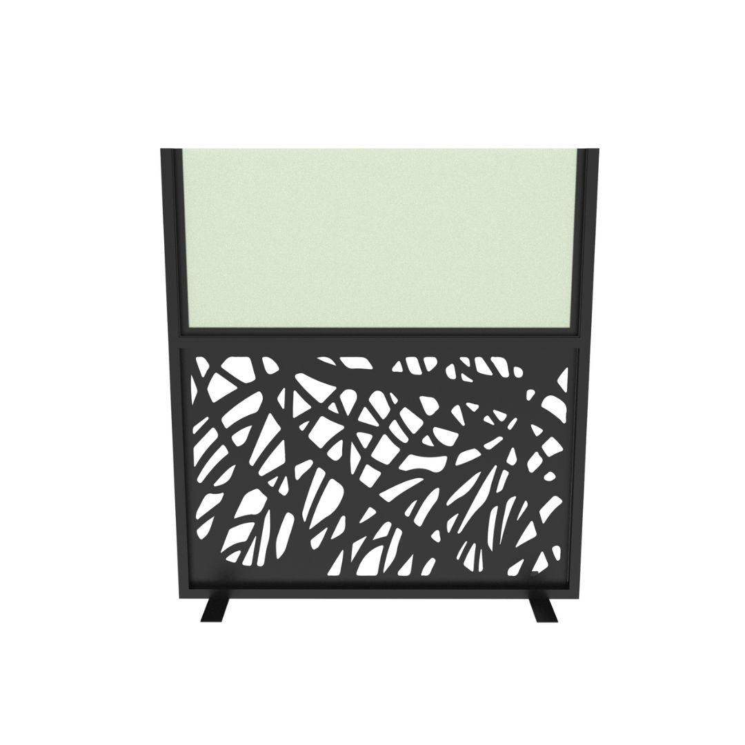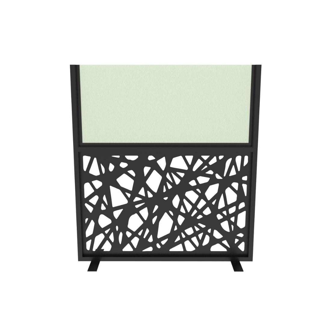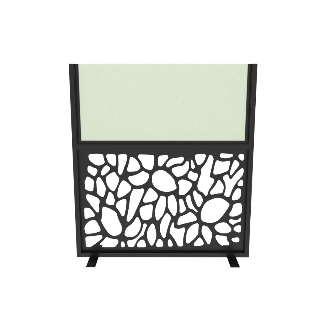 Fabricada a partir de un marco perimetral en perfil rectangular y cejas laterales para su fácil unión entre varias mamparas. En su parte superior cuenta con una pantalla en vidrio templado en 60cm o acrílico de 6 mm de espesor. En la parte inferior es una celosía fabricada en lamina de acero rolada en frío cal.14. Por último, la mampara está soportada sobre una placa metálica que le da estabilidad.