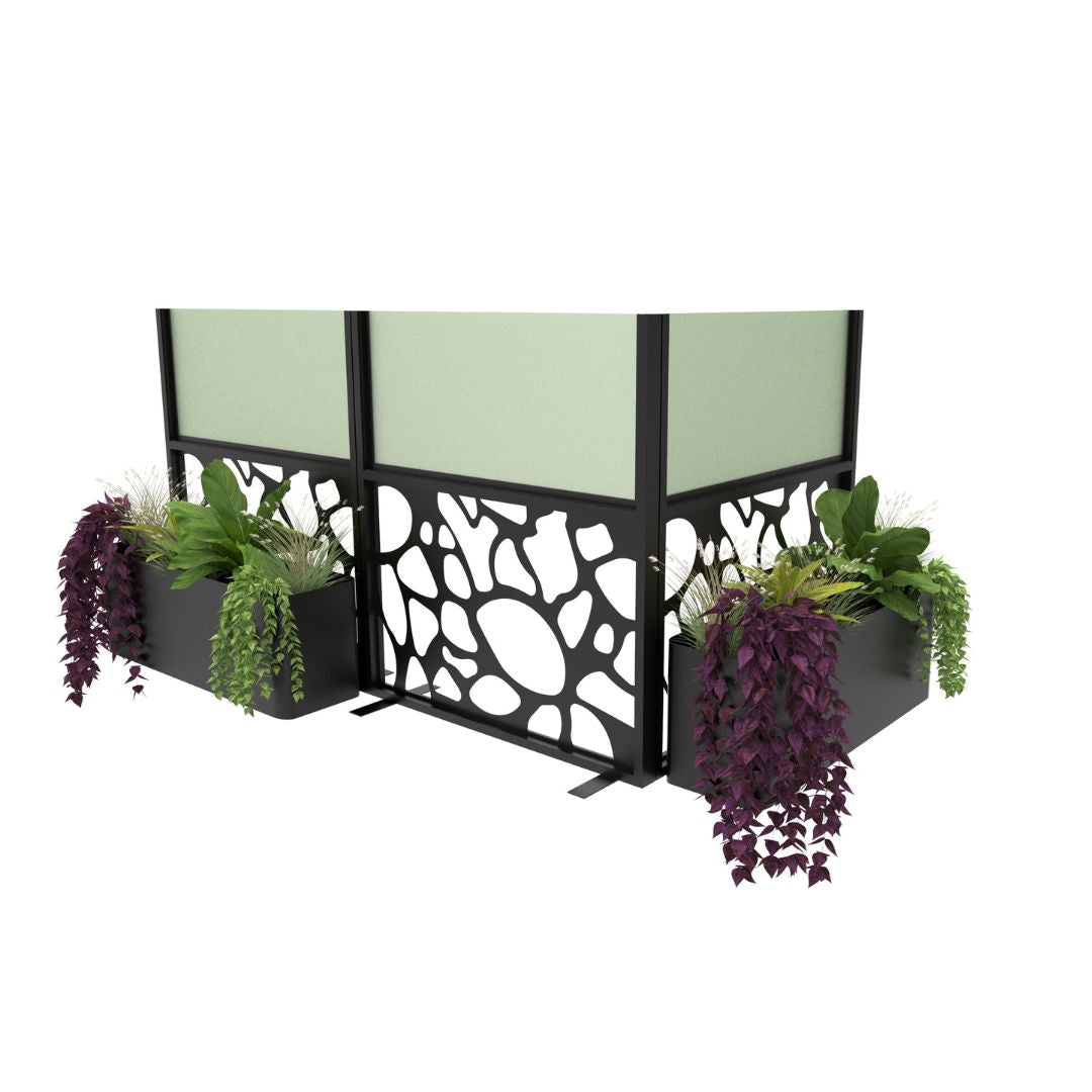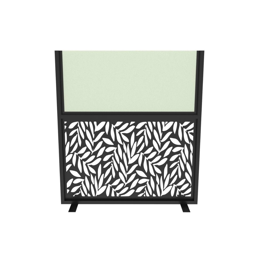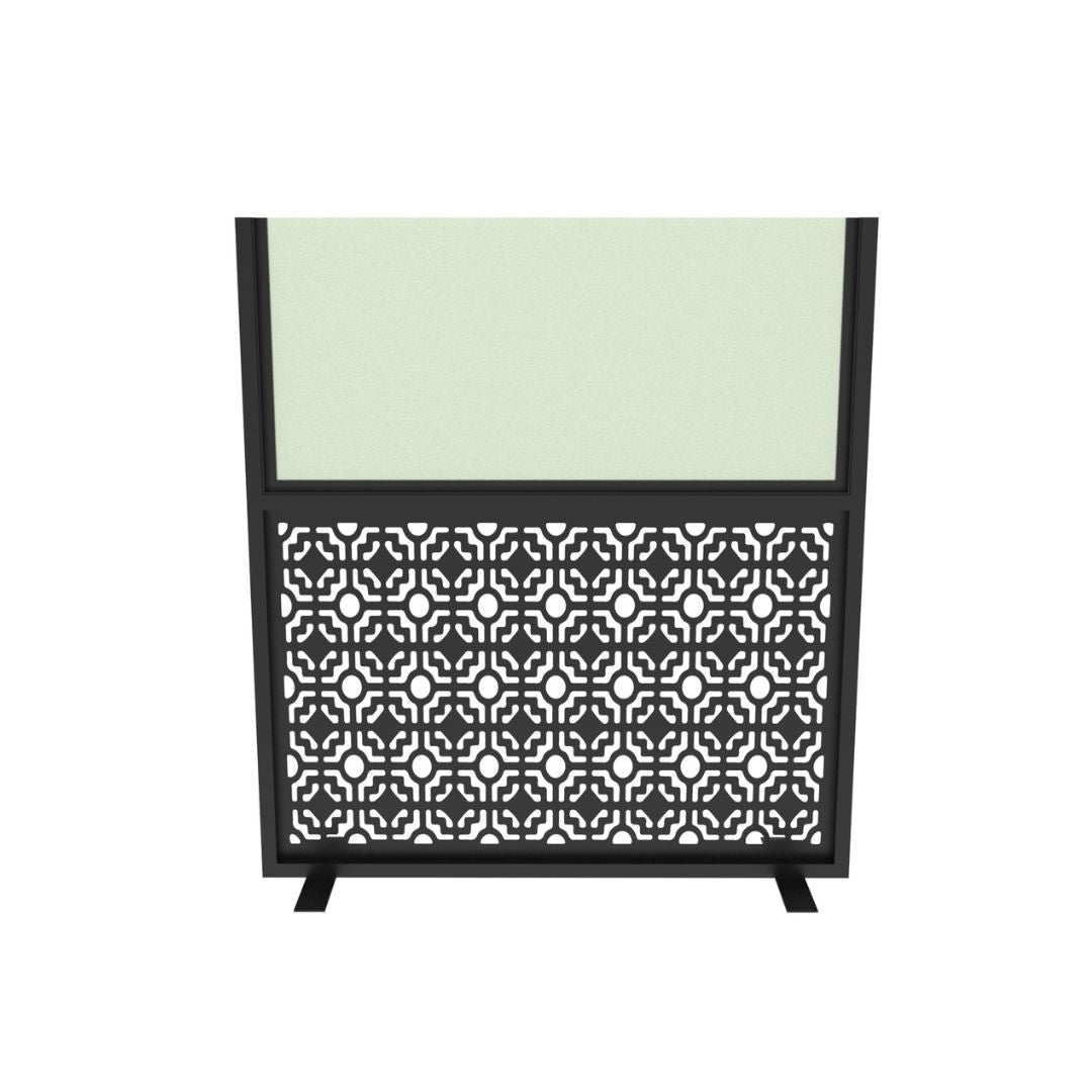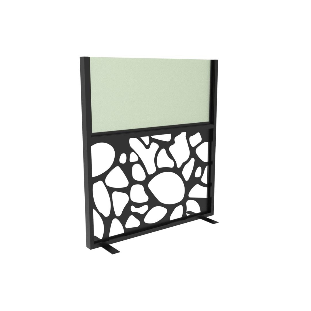 Fabricada a partir de un marco perimetral en perfil rectangular y cejas laterales para su fácil unión entre varias mamparas. En su parte superior cuenta con una pantalla en vidrio templado en 60cm o acrílico de 6 mm de espesor. En la parte inferior es una celosía fabricada en lamina de acero rolada en frío cal.14. Por último, la mampara está soportada sobre una placa metálica que le da estabilidad.